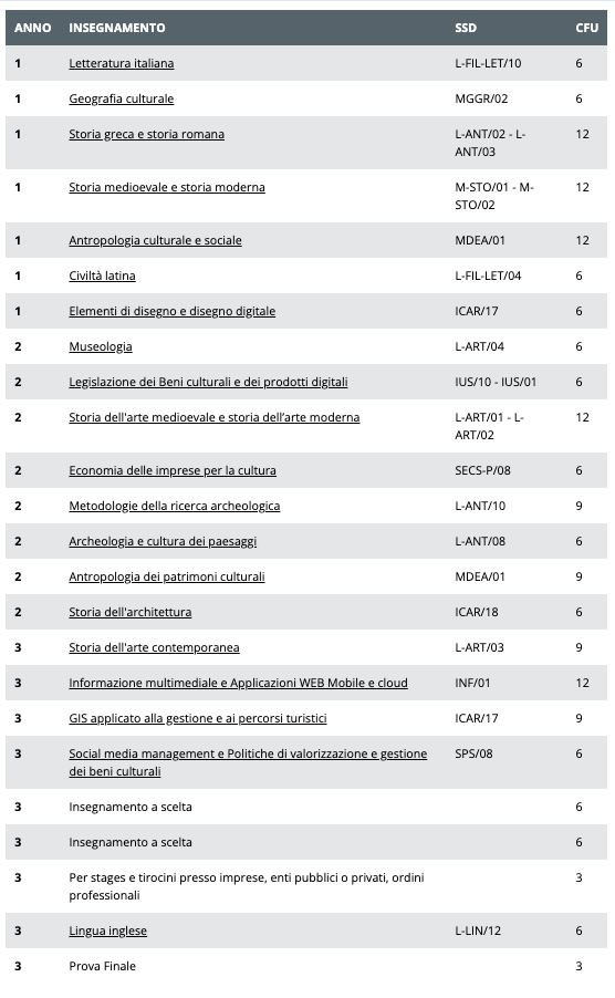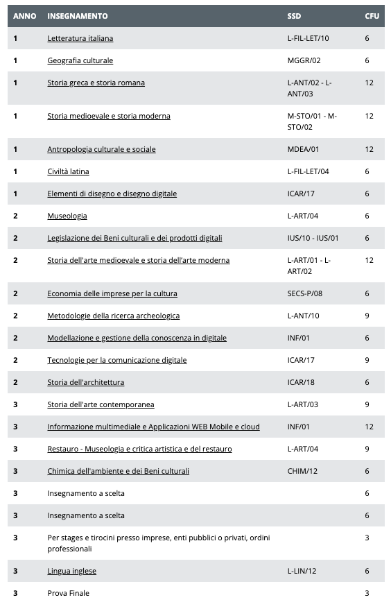 Il percorso formativo in Patrimonio Culturale in era digitale della classe (L-1) Beni culturali è articolato su tre annualità per un totale di erogazione di non meno di centottanta crediti formativi universitari (180 CFU).