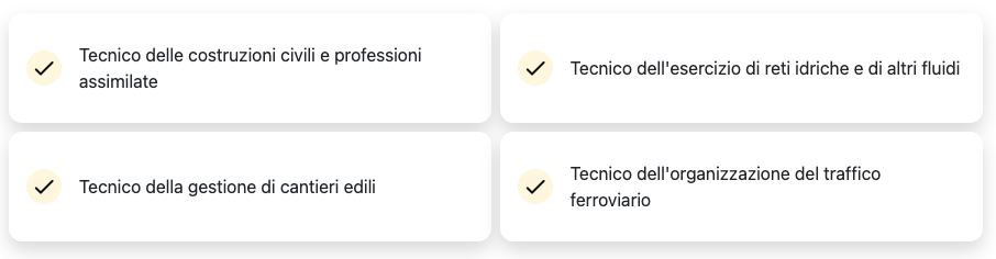 Conoscenza delle discipline ingegneristiche nel campo delle opere civili (strutturali, geotecniche, idrauliche, marittime, delle infrastrutture e sistemi di trasporto, edilizia sostenibile, strade, ferrovie e aeroporti, topografia, opere per la produzione di energia elettrica da fonti rinnovabili) ambientali (gestione degli interventi di difesa del suolo e di tutela dell’ambiente, compresi i relativi impianti /sistemi / strutture) e della sicurezza (impianti e cantieri, protezione civile, protezione dai rischi naturali) che consentano lo svolgimento di attività quali il dimensionamento di semplici strutture, il calcolo idraulico di canali e condotte, il dimensionamento di semplici opere geotecniche, il dimensionamento di opere marittime e di protezione dei litorali di limitata importanza, la progettazione di semplici infrastrutture stradali, il dimensionamento di opere idrauliche e sanitario-ambientali ordinarie;