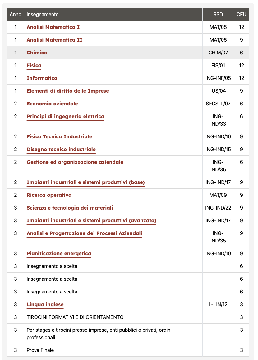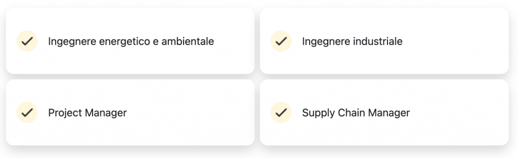 Il laureato acquisisce durante il corso di studi conoscenze sia di base che ingegneristiche applicative nell’ambito dell’ingegneria industriale. Il percorso formativo ha un approccio metodologico flessibile che consentirà alla studente di svolgere funzioni tecnico-operative in ambito industriale, ma anche di gestione e coordinamento di piccole unità operative.