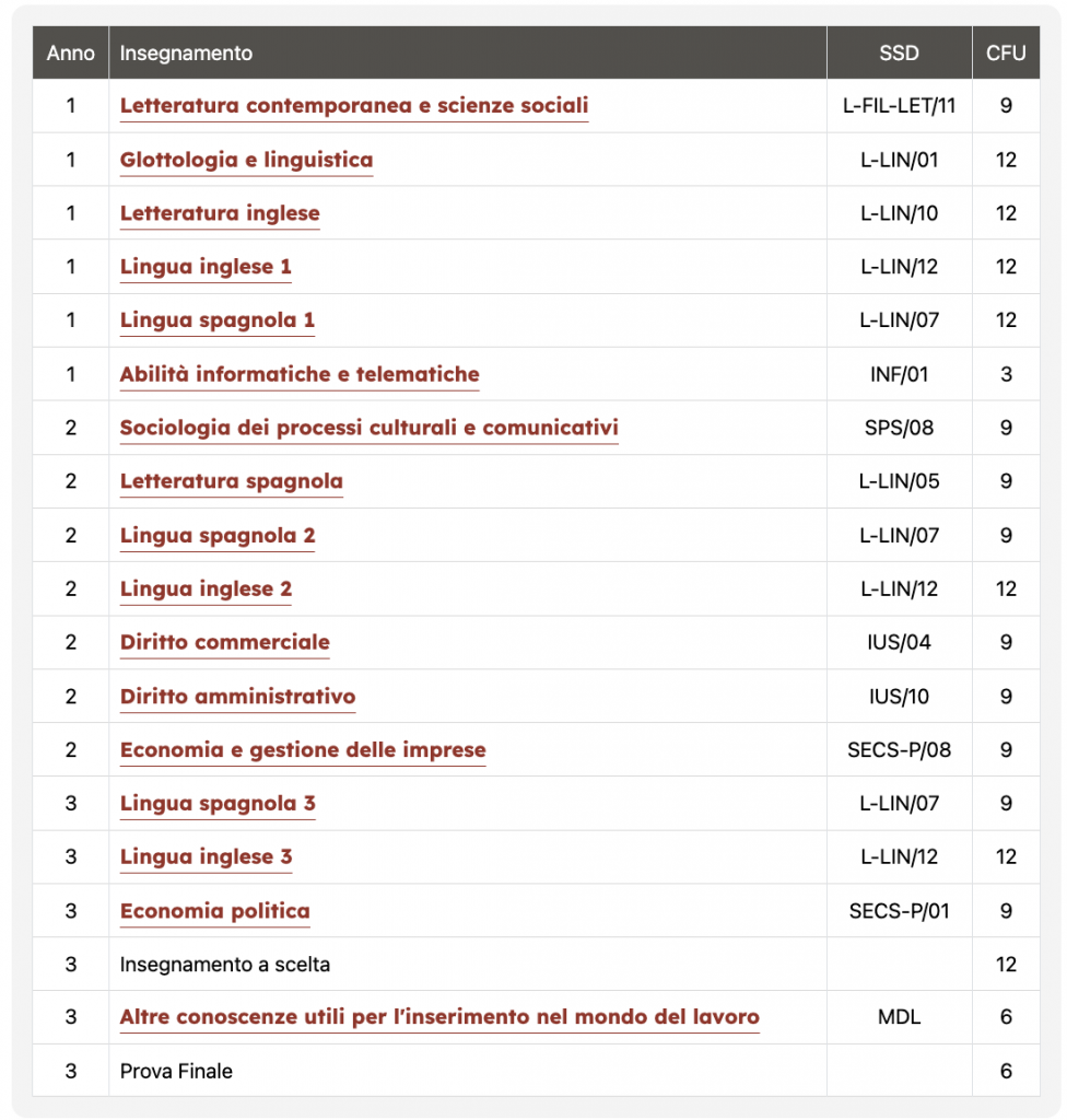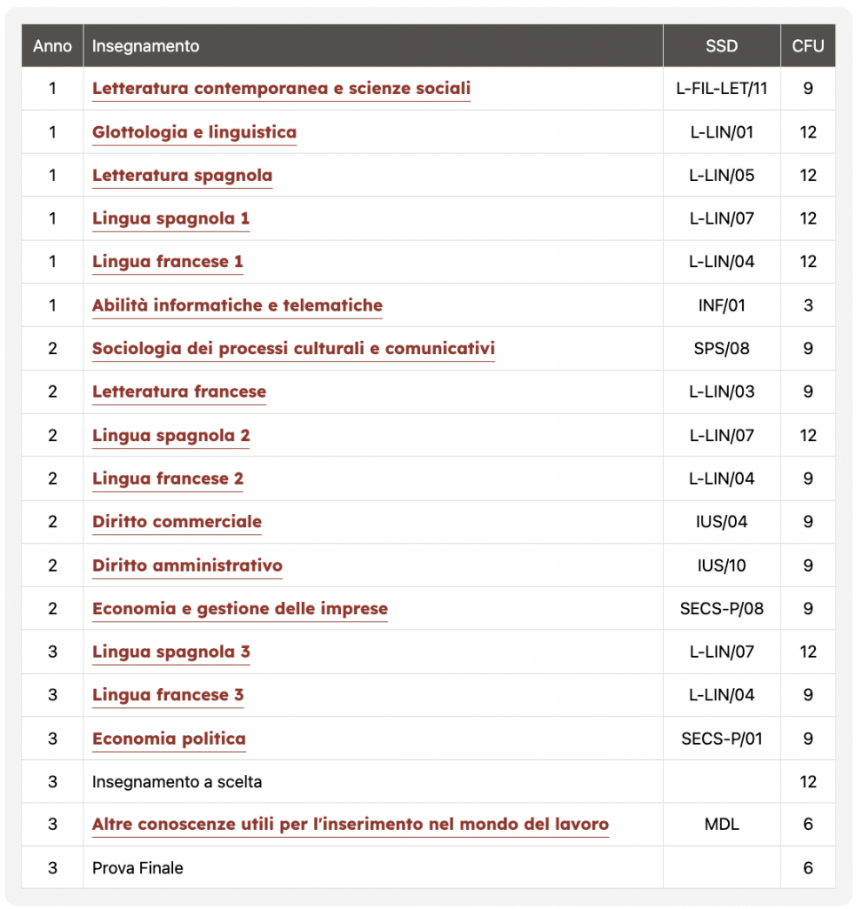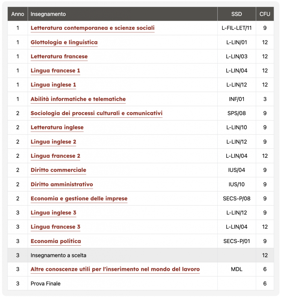 Il percorso formativo offre una solida preparazione linguistica e culturale in due lingue straniere (a scelta tra quelle attivate nell’offerta formativa) delle loro varietà linguistiche (con competenza scritta e orale nei linguaggi settoriali), delle culture e delle aree su cui tali lingue sono utilizzate come veicolo principale di comunicazione ufficiale, oltre all’italiano, integrata dalla conoscenza degli aspetti giuridici, economici e socio-culturali con particolare riguardo ai registri propri delle organizzazioni imprenditoriali e degli enti che operano in ambito internazionale.