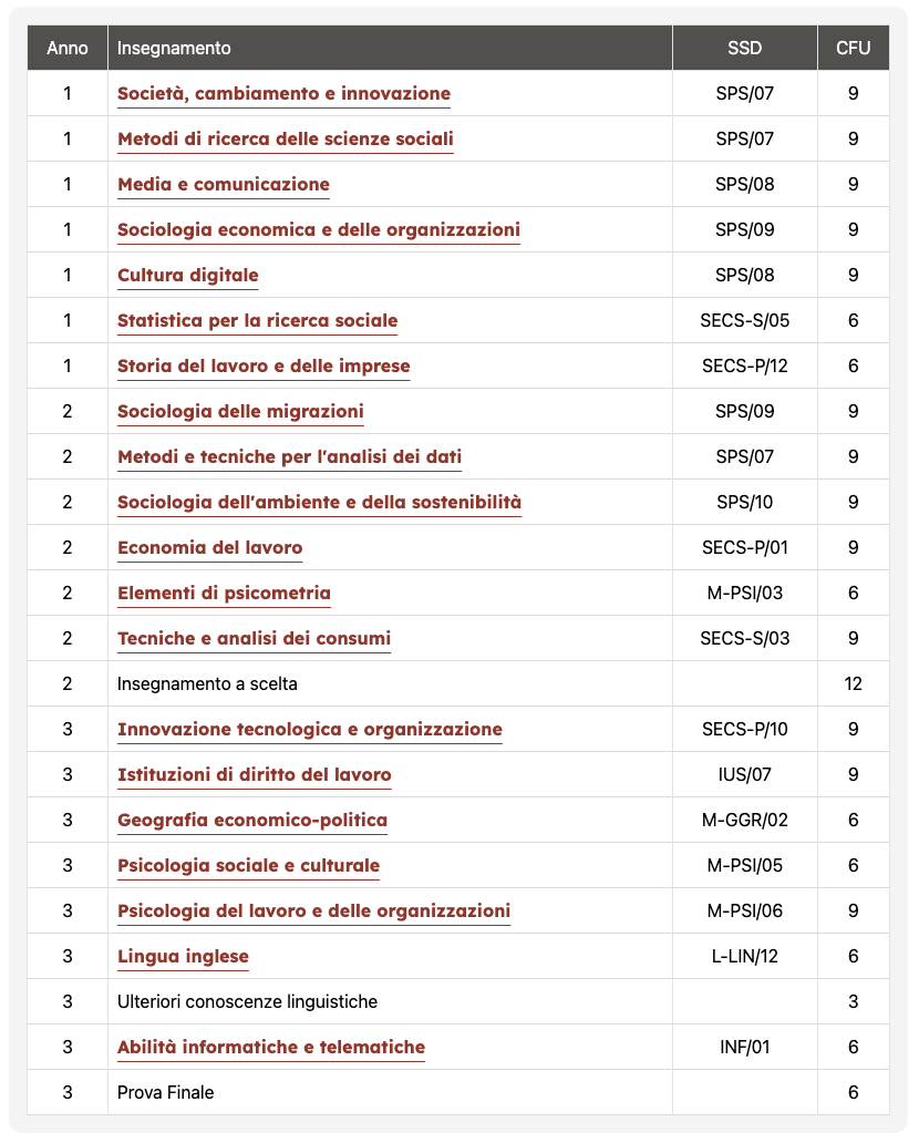 L’indirizzo preso dal corso di Laurea verterà sull’aspetto economico e della ricerca sociale e l’obiettivo principale sarà quello di consolidare la padronanza dei metodi e delle tecniche di ricerca della sociologia e delle altre scienze sociali ed offrire agli studenti competenze teoriche, pratiche ed operative per l’analisi dei fenomeni sociali, con uno sguardo specifico ai processi economici, organizzativi e del lavoro, ai fenomeni migratori ed ambientali, alle disuguaglianze sociali, alle politiche sociali ed ai processi formativi.