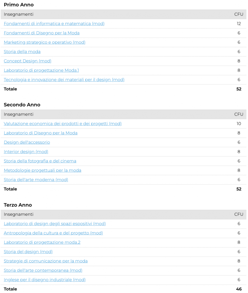 A tal fine, il corso si articola su due curricula specifici, uno con indirizzo Moda ed uno con indirizzo Design, concepiti per armonizzare sia l’approfondimento delle materie di base, necessarie per l’eventuale prosieguo degli studi, che lo sviluppo di competenze applicative, diversificate e caratterizzanti per i due ambiti, particolarmente richieste per l’inserimento dei laureati nel mondo del lavoro.